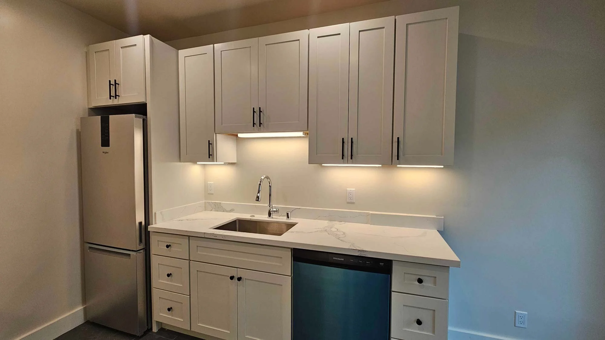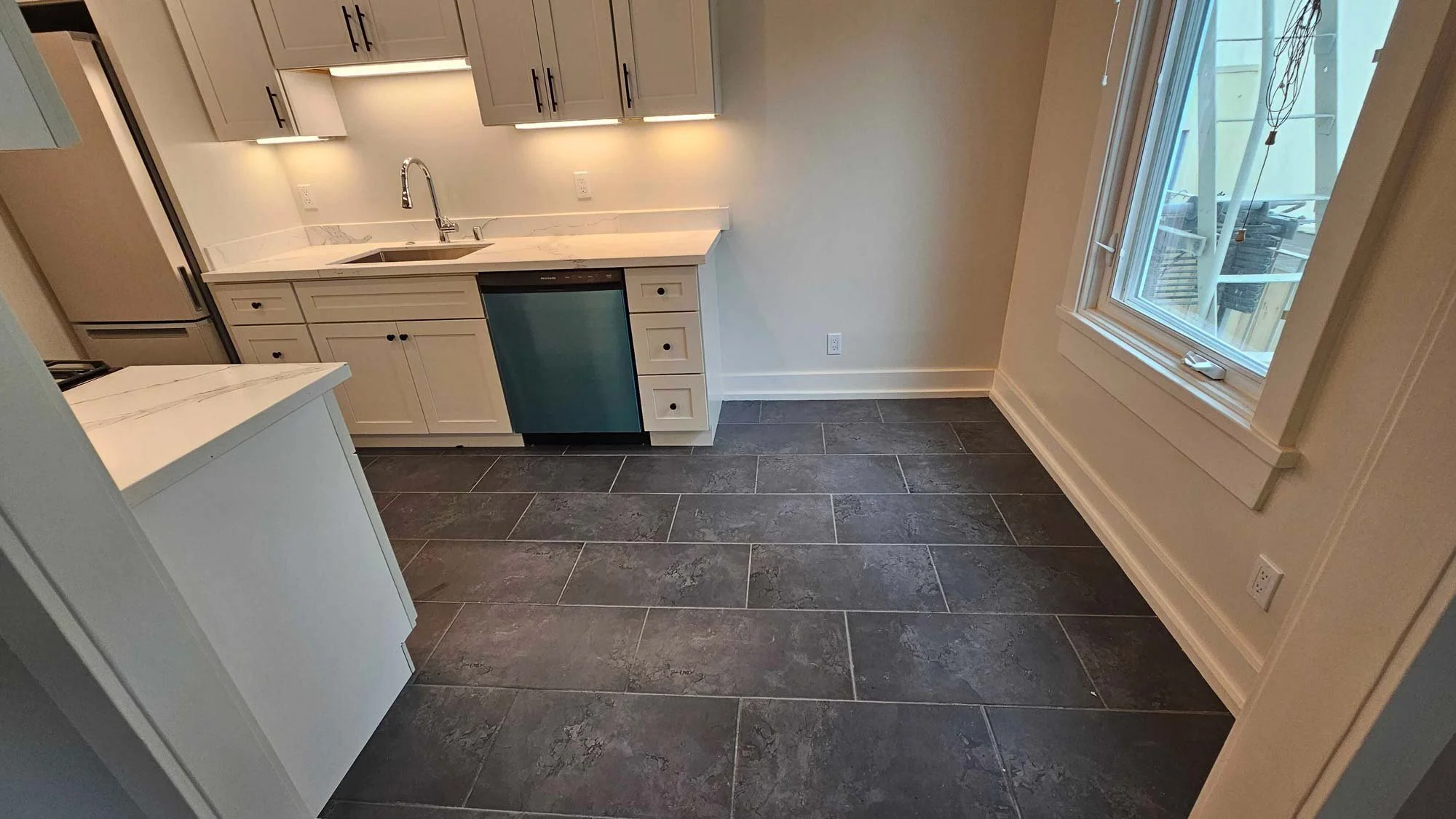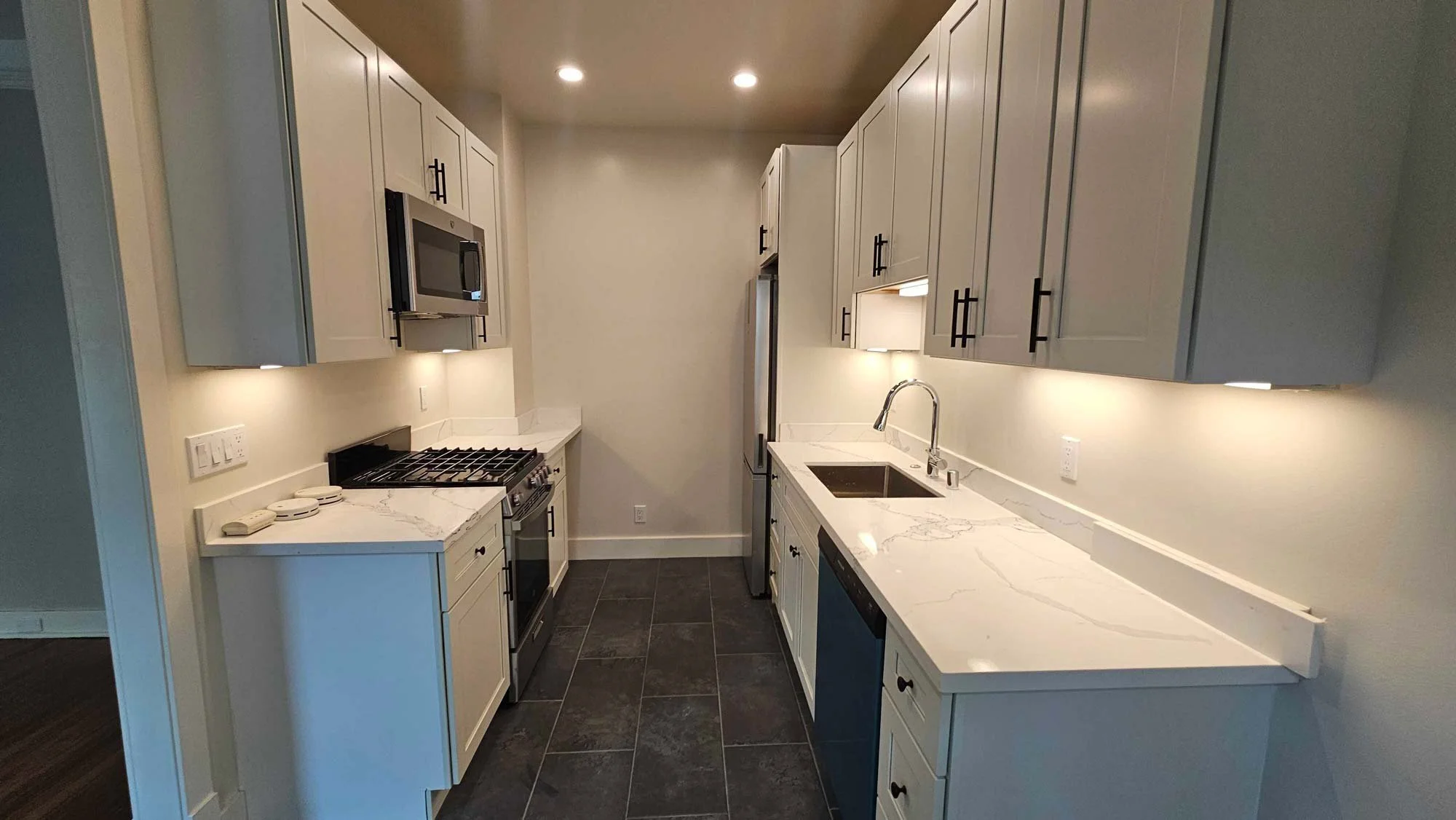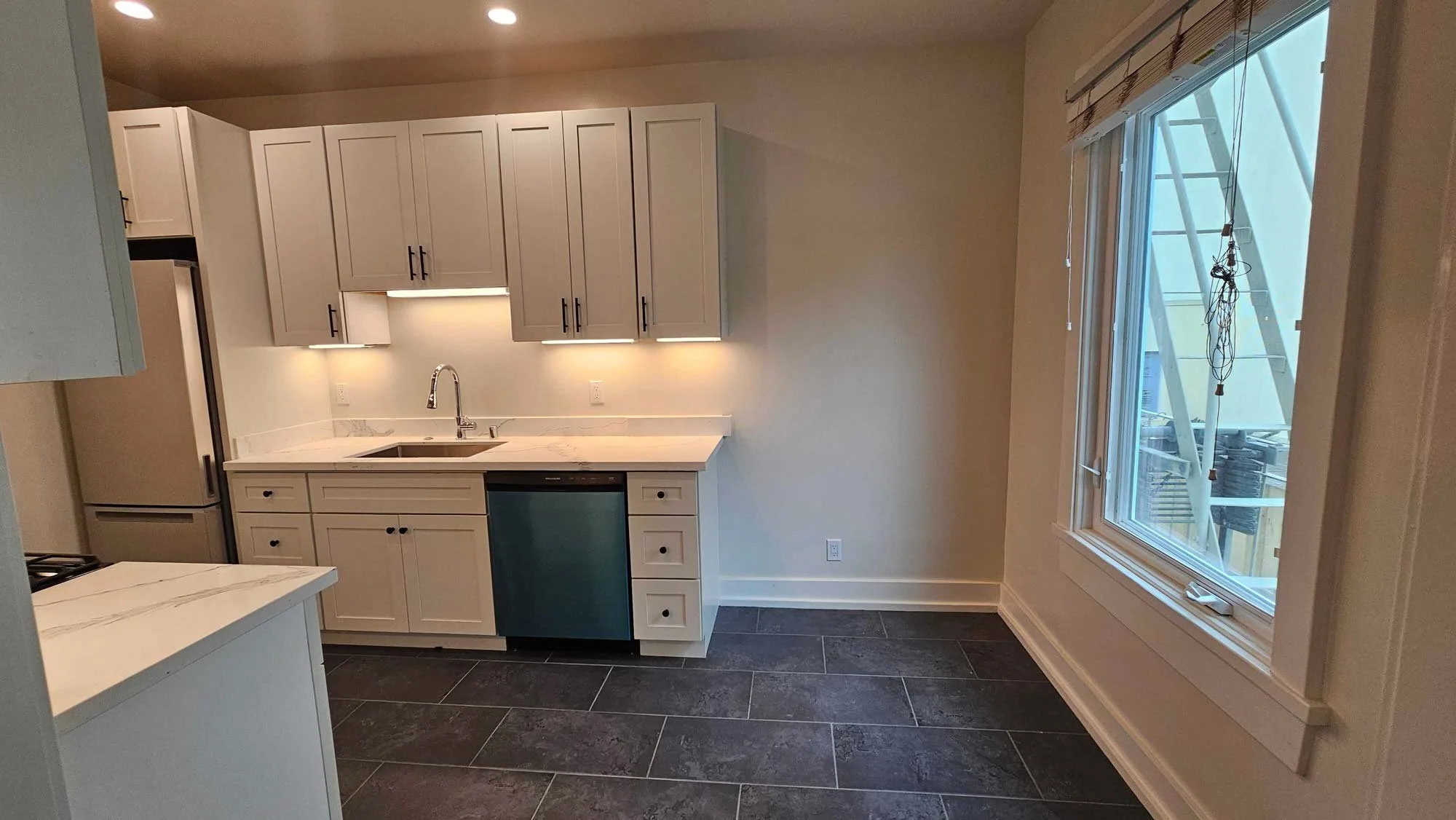 The kitchen features white shaker cabinetry with quartz countertops and all new stainless steel appliances which includes a European style counter depth refrigerator, full size 24-in dishwasher, and microwave hood over stove. Kitchen features recessed lighting and a small area for a window side breakfast nook.